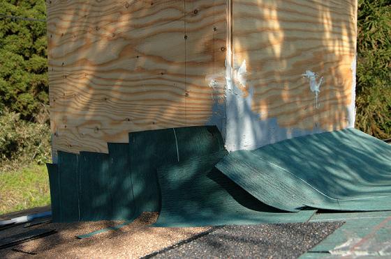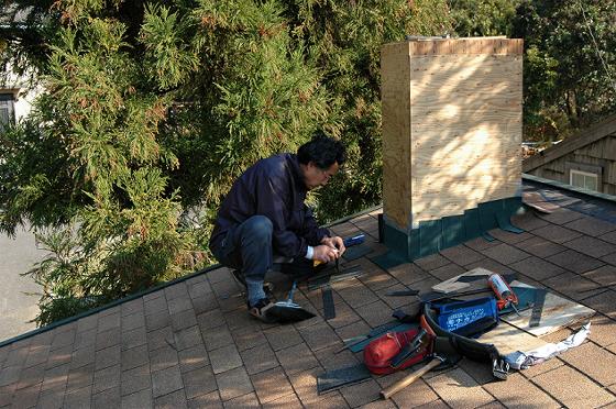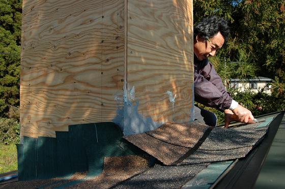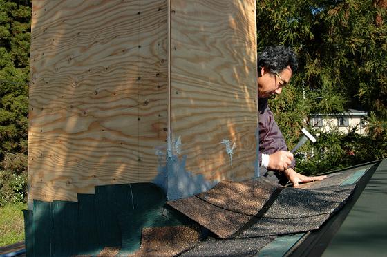 コーキング処理した後に防水シートをL字型に煙突囲いの下部に接するように張り付ける。そして屋根材を敷き詰めていく。