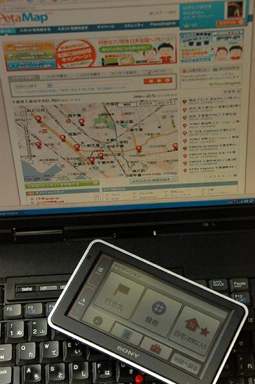 PetaMapというサイトで位置情報を作成して、それをファイル変換してダウンロードしてメモリースティックに保存して、カーナビのスロットに挿入して読み込ませてやるという手順が必要となる。パソコン上の地図からのカーナビへの目的地の流し込みが、付属のUSBケーブルでの接続では実現せずに、別売りのハードウェアが必要になるというのがちょっとなんだかな状態だ。単なる位置情報として扱うのではなく、目的地の説明の写真やテキストなども一緒のガイドブック的な機能を持たせているから仕方ないのだろう。