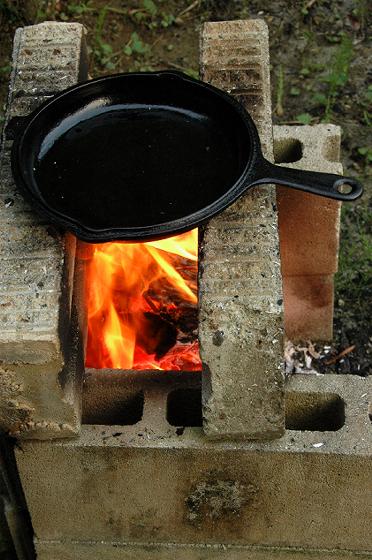 簡易釜戸で土鍋ご飯を炊いた後にも、まだ薪は燃え尽きずに火力は十分に残っている。