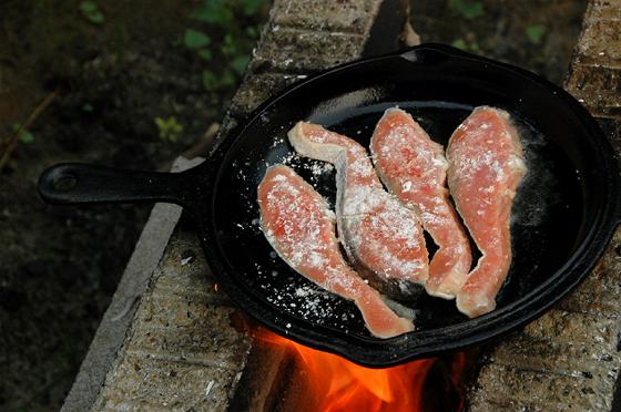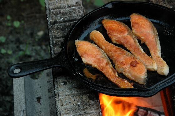 そこで次はダッチオーブンの蓋(スキレット)を持ってきて火にかけてやる。油を入れて十分に温度が高くなったところで、小麦粉にまぶしたシャケを入れてやる。両面ともこんがり焼けたら、完成だ。分厚い鉄板に薪の熱が伝わって遠赤外線で焼いた味は格別だ。