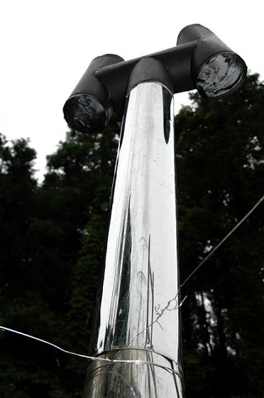 以前に煙突の仕様変更をして、自作の二重断熱煙突の屋外側の内筒の106mmを撤去して外筒の150mmのみ残してシングル化した。その際に不具合が出たらまたすぐに変更できるようにと固定のステーを取り外したままにしておいた。このため強風が吹くと煙突がぐらついてちょっと不安定だった。
