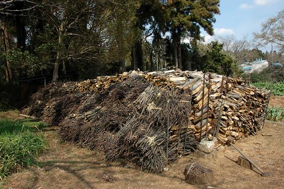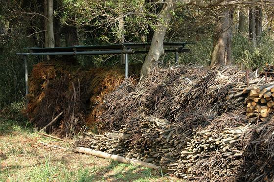 焚き付け用の杉の葉だけは雨に濡れると使い物にならなくなるのでその部分にだけ屋根をかけてあり、それより太い柴、枝、薪に関しては屋根なしで雨さらしだ。同じ太さごとにまとめてきれいに整理されていて、取り出す時もとても使いやすそうだった。
