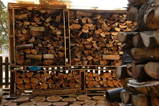 下部は地面からの湿気の影響を受けやすいため、薪ストーブ用の薪ではなく、庭でのバーベキューや焚き火、釜戸用の杉の薪を保管。