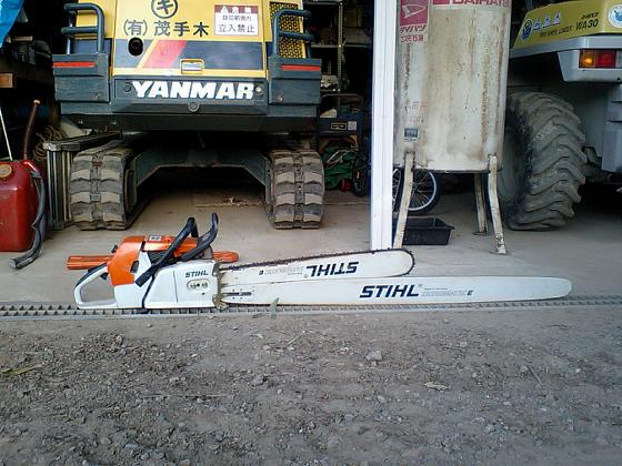 こうして置かれていると普通のチェーンソーと同じように見えてしまうが、その重さ、長さ、大きさは半端ではない。後ろにある重機と比較してみると大きさのイメージがつかめると思う。手にとらせてもらったが、持つのがやっとでこれを使って木を切るなんて考えられなかった。