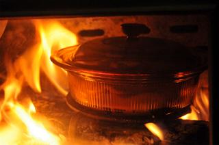 それを熾き火からゆらゆらと炎が上がっている状態の炉内に五徳を入れて、その上に投入。