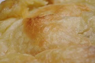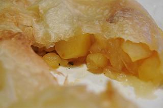 あらかじめ、薪ストーブの天板で砂糖とシナモンで煮込んでおいたリンゴを、冷凍パイ生地を解凍したもので包み、耐熱ガラスの容器に入れる。