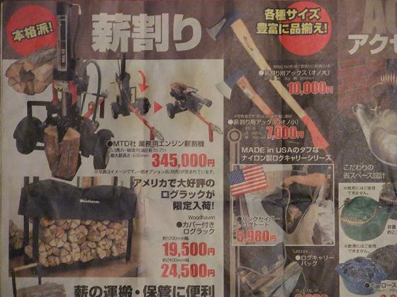 昨日紹介したホームセンターのチラシの中で「薪ストーブ」「斧」「スキレット」などは既に持っているし使っているのであまり欲しいと思わないが、自分が持っていない「薪割り機」は興味がある。