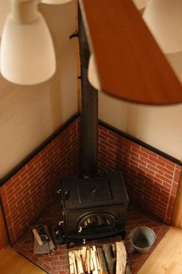 薪ストーブは触媒式のFA265だ。まだ設置されたばかりで炉中に取り扱い説明書などが入っている状態。翌シーズンからの稼動予定。炉台は既製品のため、薪ストーブ本体のみを乗せるぎりぎりのサイズ。