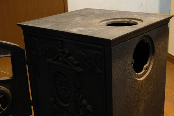 薪ストーブの中には、この写真のように排煙口を天板か背面を選択することができる機種もある。どちらかに蓋をねじ止めして、どちらかに排煙口をねじ止めして排他利用できるようになっているのだ。