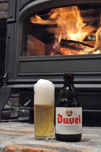 ベルギー製の薪ストーブの前でベルギービールをいただく