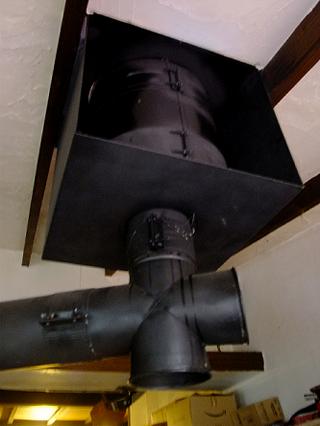 この陶芸工房の母屋でも直径30センチの断熱煙突を使っている。普通の二重断熱煙突とは迫力が違う。外部の煙突だけ見ると判りにくいけど、室内側の100ミリの煙突との接続部分を見ると、その差がはっきりとする。