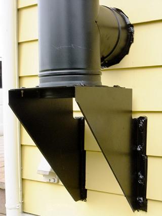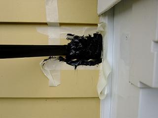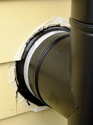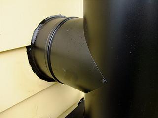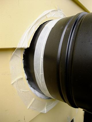 この部分だけでなく、同様に煙突ベースや、縦引き煙突のステー固定したネジ部分もコーキング処理して雨が外壁の内部へ染み込んでくることを防止する。