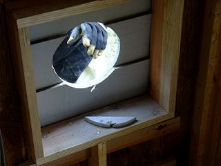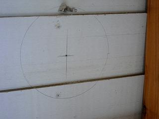 室内側から芯を出してから、屋外側にも円周を書いてドリルでジグゾーの刃を入れる穴を開ける