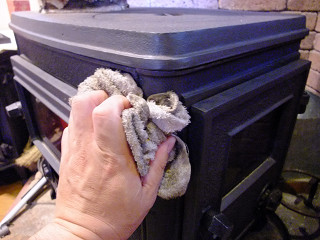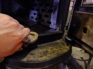 梅雨明けして本格的な夏に入った時点で薪ストーブの炉内から灰を撤去して、錆びはワイヤーブラシとウェスで落とした後に、5-56をつけたウェスで拭いておいた。