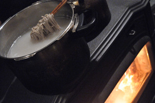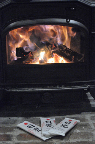 「これから薪ストーブ店をやりたい」と、アース・リーに相談に見えた方から、その方の作った会社の製品の蕎麦を、お土産にいただいた。郷土への愛を感じる気合の入った一品だ。これは「薪ストーブで茹でて、年越し蕎麦にするしかない!」と決めて、激動の2011年の終わりの今夜いただいた。