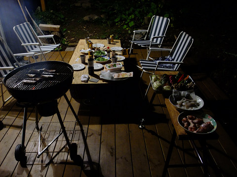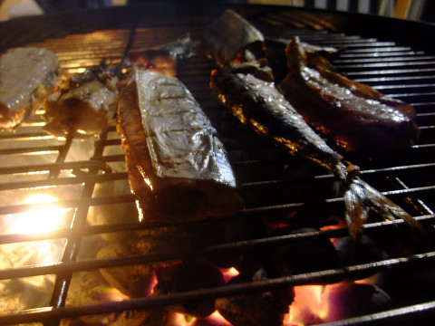 バーベキューと言えばバーベキューコンロで炭火で焼くパターンが多いけれども、蓋付きの大型バーベキューコンロを使うと、熾き火だけでなく蒸し焼きのダッチオーブン効果で美味しさが倍増する。まずは秋の新鮮な味覚のサンマを焼いていただいた。