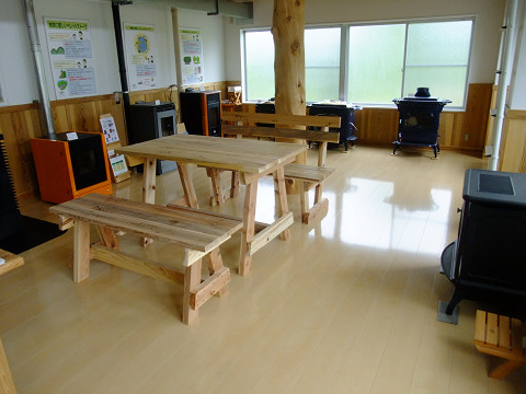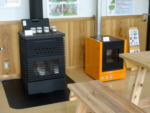 千葉県山武市では公共施設の暖房で使うバイオマス燃料を地元で作っている。その生産工場にはペレット・ストーブのショールームが併設されている。オシャレでモダンなデザインのものも数多く揃っている。