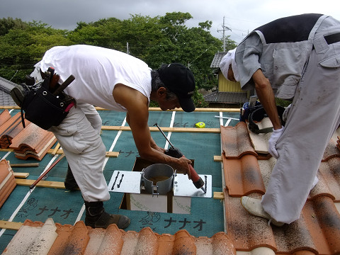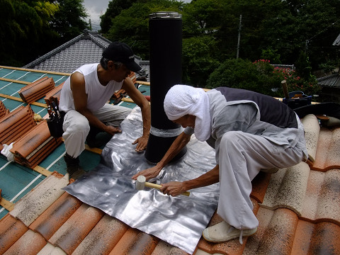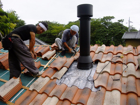 瓦屋さんにバトンタッチして煙突開口部周辺の瓦を葺いてもらう