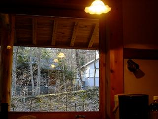 窓の外にはアンティークの照明が反射して屋外も連続した空間のよう