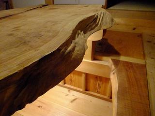『アースの家』は漆喰、土壁、無垢の木だけを使った本物の自然素材の家だ。対面式のキッチン前の造りつけのカウンターテーブルにも当然、無垢の板を使っている。