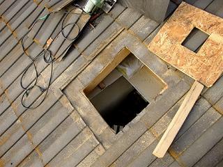 当然、屋根を抜く工事も自分で行った。屋根の下地の構造材のパーチクルボードを丸鋸でくりぬいた。中心部に小さい四角い穴が開いているのは本番で屋外側から切り込みを入れる前に、室内側からボードの向こう側がどうなっているのかを確認するためだ。こういう廃材は普通は捨てることになるけど、我が家では記念に椅子を作成した。