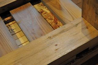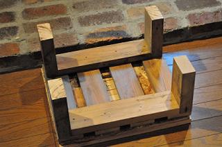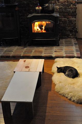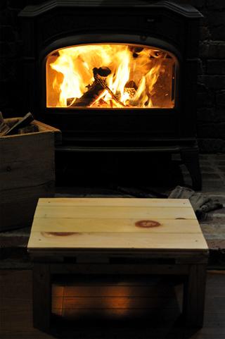 中心部に穴が開いたままだとおかしなことになるので、これまた廃材の無垢の杉板のフローリング材を座板として張って、足をつけたのだ。薪をくべたり、灰を撤去する時に座るといい感じ。