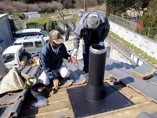 瓦を元に戻していく。必要に応じて切断機で瓦を切って形を作っていく