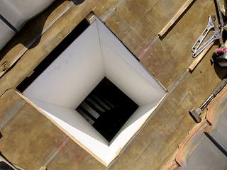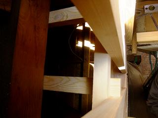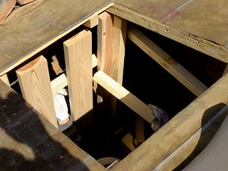 屋根裏に煙突を通す前に煙突囲いを作成する。煙突の荷重を受けることになるので、がっちりと建物の構造部分に固定しつつ、必要な強度を確保する。