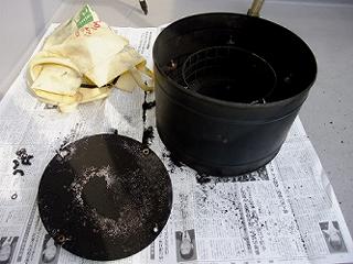 屋根に上がるのが怖いとか面倒だといって煙突掃除を室内側の下からブラシをつついただけでは、トップ部分の煤はほとんど除去できない。実は煤は排気温度の下がるトップ部分に集中的に付着しているのだ。トップを取り外してワイヤーブラシで落としてやらないと根本的な対策にはならないのだ。