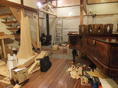 今回、薪ストーブの無煙コンサルに行ったところは、楽器の修理、製作工房だった。チェンバロを作っている途中に薪ストーブ導入工事を行った。色々と楽器製作の裏話や歴史を聞かせてみらって興味深かった。 1840年代のフランスのピアノをはじめとして、貴重な珍しい博物館ものの楽器が並ぶ中に、新たに薪ストーブの火が入った。12月にこの空間でコンサートが開かれるそうだ。寒い時に、薪ストーブの炎を眺めながらのコンサートって居心地が良さそうだ。