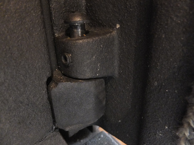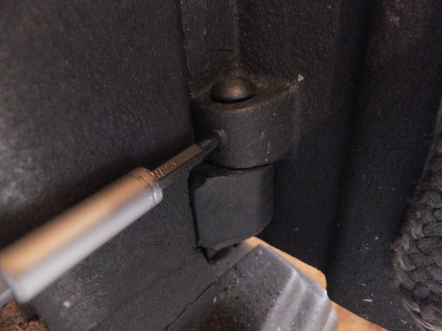 このピンは以前はただはめ込んでいただけだったけど、何度も開け閉めしているうちに少しづつピンが浮いてきてしまうことがある。時々気づいた時に押し込んだり叩いて戻してやれば、特に問題はないのだけど、意識しないで使っているとある日突然ピンが外れて扉が外れてしまうようなこともある。扉の開閉時にいきなり、扉が外れるとびっくりするし、状況次第では危険も伴う。