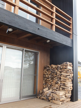 お客様は、この場所とは別の、単管パイプで組んだ家の横の屋根のない雨の当たる薪棚に入れようとしていたけど、せっかくの即戦力の2年乾燥薪の保管場所としてはふさわしくない。 薪ストーブのすぐ近くに掃き出しの窓があって、その外が雨の当たらないウッドデッキになっていたので、そちらに積むことを提案した。窓を開ければすぐに焚く薪が手に取れるので、はるかに快適だろう。