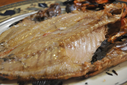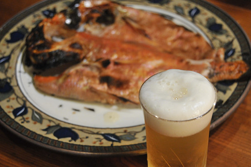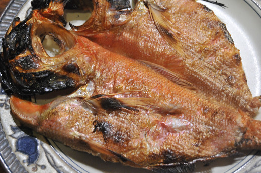 帰りに何と、銚子名産の干物をいただいた。これはもう、薪ストーブで焼くしかない。ということで、帰宅してから夕食にいただくことにした。薪ストーブで魚を焼く時は炎がボーボー上がっている時ではなく、弱めの熾き火の状態で行う。炉の中に五徳を置いて、金網を乗せて、その上に魚を置いて扉を閉める。炉内はグリル状態になって美味しく炭火焼になる。