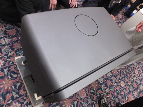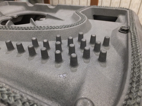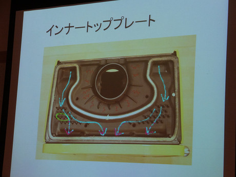 天板を取り外すとその内部の形状に高性能、高効率の秘密の一つが見える。突起がたくさん見えるけど、この突起によって炉内の熱をより多く外に放出するようになっている。従来機の640CB/760CBも天板下のこの部分は似たような空気の流入経路だけど、この突起はない。『ヴィンテージ』は新世代の機種として改良が加えられている。後方から流入したエアカーテン用の空気が突起によって強力に温められて、炉内のガラスに上部のスリットから吹き付けるようになっている。それとともに天板の温度を速やかの上昇させる働きをしている。