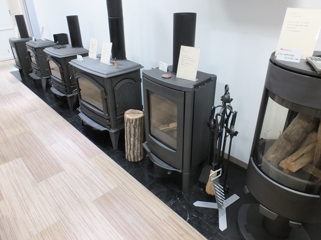 メトスの代表的な取り扱い機種のドブレの薪ストーブがずらりと並んで壮観