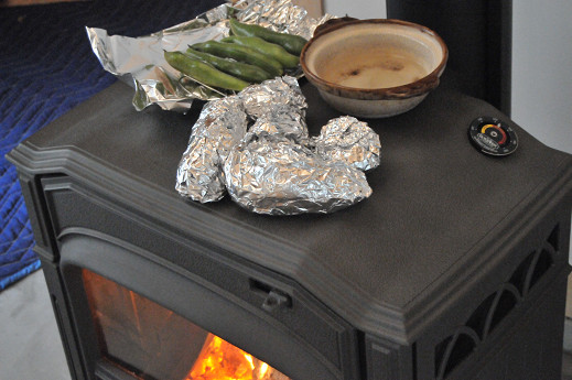 薪ストーブ導入初日からいきなり天板料理 2012/3/27(14年前) 薪ストーブ料理 0 薪ストーブを焚いていると、その熱を有効活用したくなるのは当然だ。奥様が早速近くの店でジャガイモ、サツマイモ、ソラマメを買ってきて、天板の上に置いた。 天板の上にたくさん置けるのはうれしい 慣らしも終盤の熾き火になった頃、美味しく焼けた