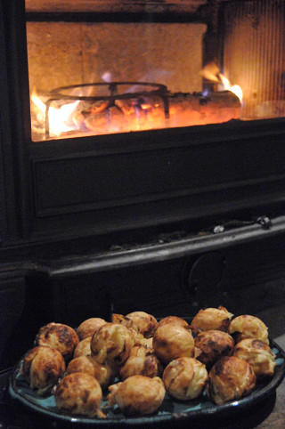 薪ストーブの炉内で「タコ焼き」を作ってみた。表面がカリっとしいて香ばしく、なおかつ中はトロトロふっくらという絶品に仕上がった。これまで色々なところでたこ焼きを食べてきたけれども、こんなに美味しいものは食べたことがないくらいの極上の仕上がりだった。薪ストーブで作るB級グルメもなかなかイケる。ピザパーティもいいけれども、タコ焼きパーティも盛り上がると思う。