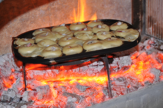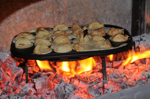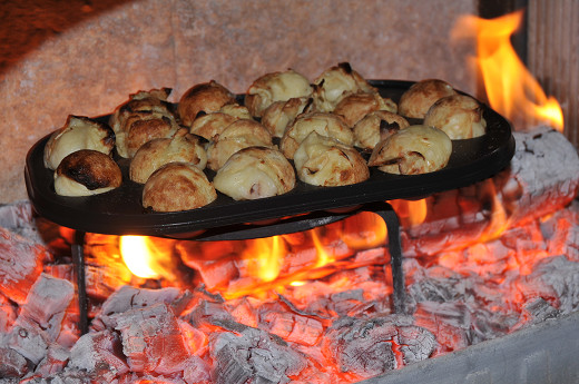 炉内でたこ焼きを作る時のコツだけど、普通のコンロで作る時とは違って、ネタを注いだり、回転させたりする時に炉内に鉄板を置いたままだと熱いので、作業の時には火ばさみや火かき棒などを両手に持って鉄板を炉台に出して行い、終ったらまた炉内に入れるとスムーズにできる。