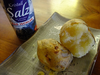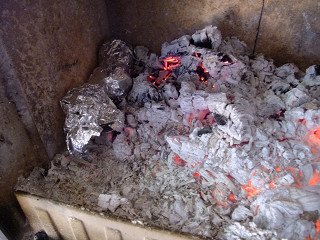 普段はガンガン焚いているので、そんな時にヤキイモを作る時には天板の上でやるけど、日中暑くなって、とりあえず火を落とすことがある。炉内の熾き火が落ち着いてききたら、ジャガイモをアルミ箔にくるんで投入して小一時間で、ホクホクのヤキイモの出来上がり。ヤキイモの場合はだいたい1時間程度で完成する火力がちょうど良いと思う。熾き火が強すぎたり、炎が立ち上がっている時には芋を投入すると、表面が焦げて、中まで火が通っていない状態になってしまう。