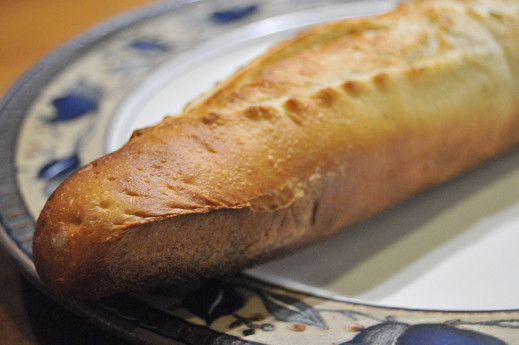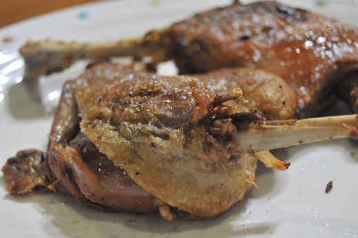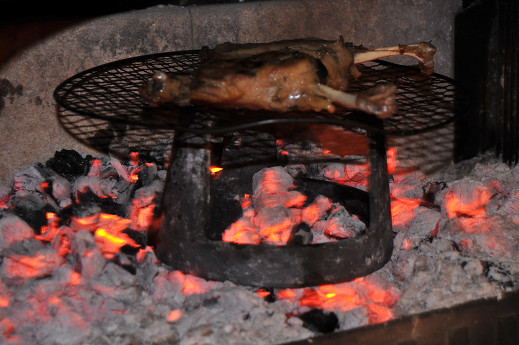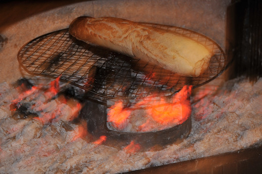 炉内の熾き火で、鴨肉とフランスパンを焼いた。