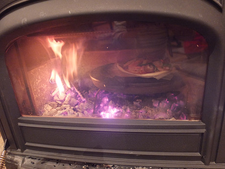 薪ストーブでのピザパーティは、みんなでその場でピザ記事の上に具を乗せて、そのまま炉内に投入して焼いていくと、ホストとゲストが分断することなく、場が持って楽しい。ゲストがピザの材料を乗せて、ホストが焼いていくという流れが良いと思う。