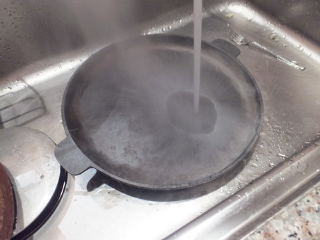 もう一つはスキレット、ピアットの冷却だ。一枚焼いた後はかなり高温になっているので、そのままの状態で次のピザを焼くと底を間違えなく焦がしてしまう。複数毎のスキレットやピアットを用意するががベストだけど、それができない場合には水で強制冷却するしかない。