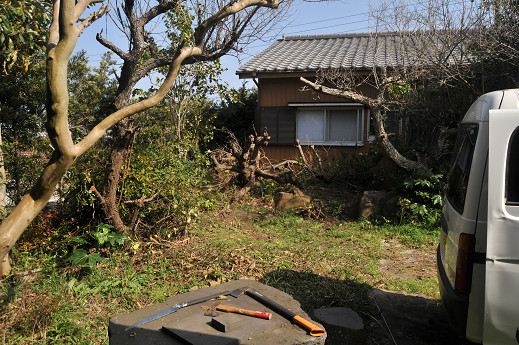 ゆで落花生さま: 現場に放置することが許される状況であれば、枝葉の部分は置いてきます。(ちなみにこの現場はそうしました) でも、それも含めて撤去という場合には持ち帰ってから、野焼き、あるいは放置して腐敗という処理をしています。 F400さまからのコメントのとおり、クリーンセンターに直接持ち込みが一番現実的だと思われます。