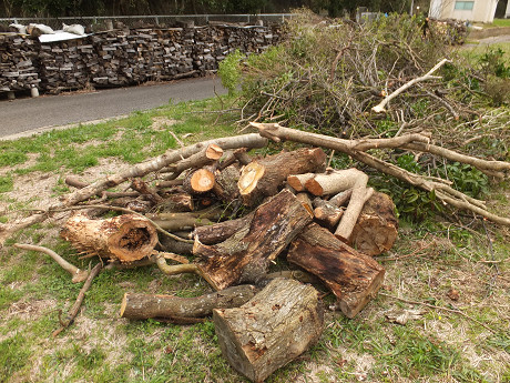 かなり大量に伐採樹木が出た。戦利品はこんな感じだけど、庭木伐採の場合には実際に薪に使える量はかなり少なく、ほとんどは枝葉なので、薪集め的にはあまり美味しい現場とは言えない。枝葉の処理は明日以降の記事で紹介しよう。