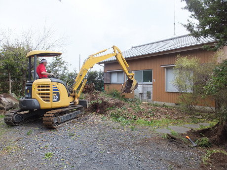 先日、庭の駐車場スペースを広げるための伐採を行ったけど、さらに追加で広くしたいということになった。今度は手作業では対応できないくらいの規模だったので、チェーンソー&ユンボが出動して機械の力で一気に作業を進めた。