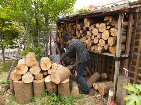 玉切り済みの薪の原木を埼玉県狭山市まで配達してきた。チェーンソー作業しないで、いきなり割ることができる付加価値の高い原木だ。 夫婦の共同作業で薪棚に入れているところ どんなニーズだか判らなかったので、とりあえず各種色んな太さを取り揃えて行ったけど、割らなくて良いそのまま炉内に放り込めるような枝の部分(※)が欲しかったようだ。次回の配達は、そういう細めの腕くらいの枝を中心に持参することにした。 ※枝の部分の在庫、2013年5月15日時点で約500kg程度の在庫残