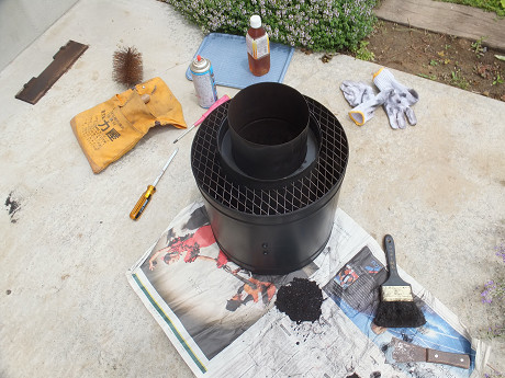 煙突のトップを取り外して、地面に降ろして、鳥の侵入防止網を取り外して、内部の煤を除去した。煤の状態はサラサラで量も少なく燃焼状態は悪くないことが解った。