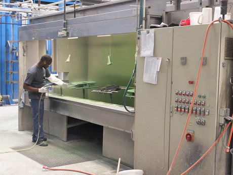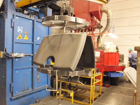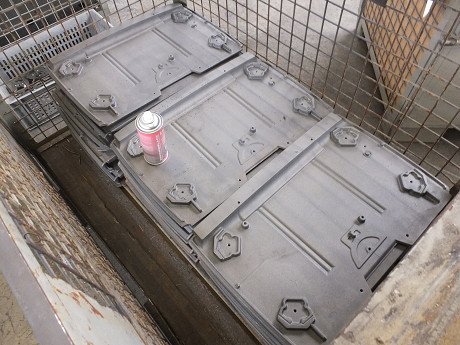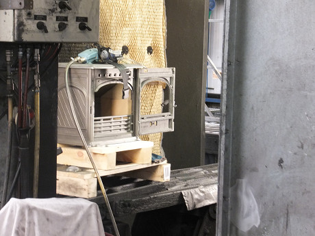 塗装作業も機械と人の作業を適材適所で使い分けて合理的な作業をしている。 機械で自動塗装されて出てきた640CB/760CBの天板部分 塗装ブースで塗装待ちの暖炉と薪ストーブ お昼休み中でこのラインでの塗装作業は見られなかった ホーロー(エナメル)の塗装作業 薪ストーブの底の部分・・・前のラインで塗装漏れがあった場合には補修スプレーで丁寧にフォローしているようだ