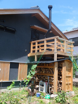 京都で煙突掃除した家は、母屋に隣接して作られた薪棚の上がベランダになっていて、普段は布団なども干せるようになっている。 煙突掃除の際にも、ここから短めのハシゴでトップに簡単にアクセスできる秀逸のアイデア。メンテナンス性、薪の搬入動線、そして室内の空気の流れの設計など薪ストーブに詳しい工務店が作った家であることが随所に感じられた。