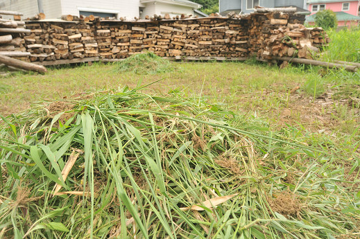 手作業とは大変ですね。 家は草刈り機でばっさばっさやってます。 おっしゃるとおり、刈った後、後ろを振り返るともう生えています。 この広い薪置き場が羨ましい。